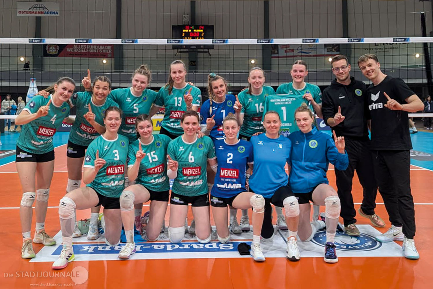 Und das Trainerfazit? „Was für ein toller Abend mit einem Ergebnis, mit dem man wohl kaum rechnen konnte!“, freute sich Trainer Tim Reichenbach zurecht und ergänzte: „Mit leicht veränderter Startaufstellung begann das Spiel aus unserer Sicht wirklich überzeugend. Wir haben uns taktisch auf Leverkusen eingestellt und wussten vor allem aus dem Hinspiel, was wir besser machen mussten. Mit guten Aufschlägen und einem sehr variablen Angriffsspiel schafften wir es, gerade zum Spielbeginn einen sehr dominanten Auftritt hinzulegen. Nicht zu vergessen sind an der Stelle zahlreiche kämpferische Abwehraktionen des Teams um eine stark spielende Salome Seidel auf der Liberoposition. Leider verloren wir ab Satz 3 dann ein bisschen den Faden. Sobald Leverkusen den Druck erhöhte, verloren wir leider zu schnell das Selbstvertrauen in die eigenen Fähigkeiten und machten zu viele eigene Fehler.