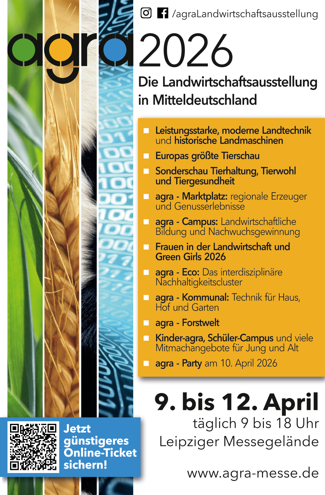 Wie wir uns auch in Zukunft gut und regional versorgen können, wie Landwirtschaft verantwortungsvoll mit Boden, Wasser und Natur umgeht, wie der Klimawandel die Arbeit auf dem Feld verändert oder wie eng die Gesundheit von Mensch, Tier und Umwelt miteinander verbunden ist – diesen zukunftsrelevanten Themen widmet sich die größte Messe der Agrarwirtschaft in Mittel- und Ostdeutschland. Viel Wissenswertes und Aktuelles, modernste Landmaschinen wie Traktoren, Mähdrescher und viele andere, aber auch historische Landtechnik für die Oldtimerfans, jede Menge Tiere und eine große Zahl von Vortrags-, Präsentations- und Erlebnisangeboten prägen die 18. agra Landwirtschaftsausstellung vom 9. bis 12. April 2026 auf dem Gelände der Leipziger Messe.