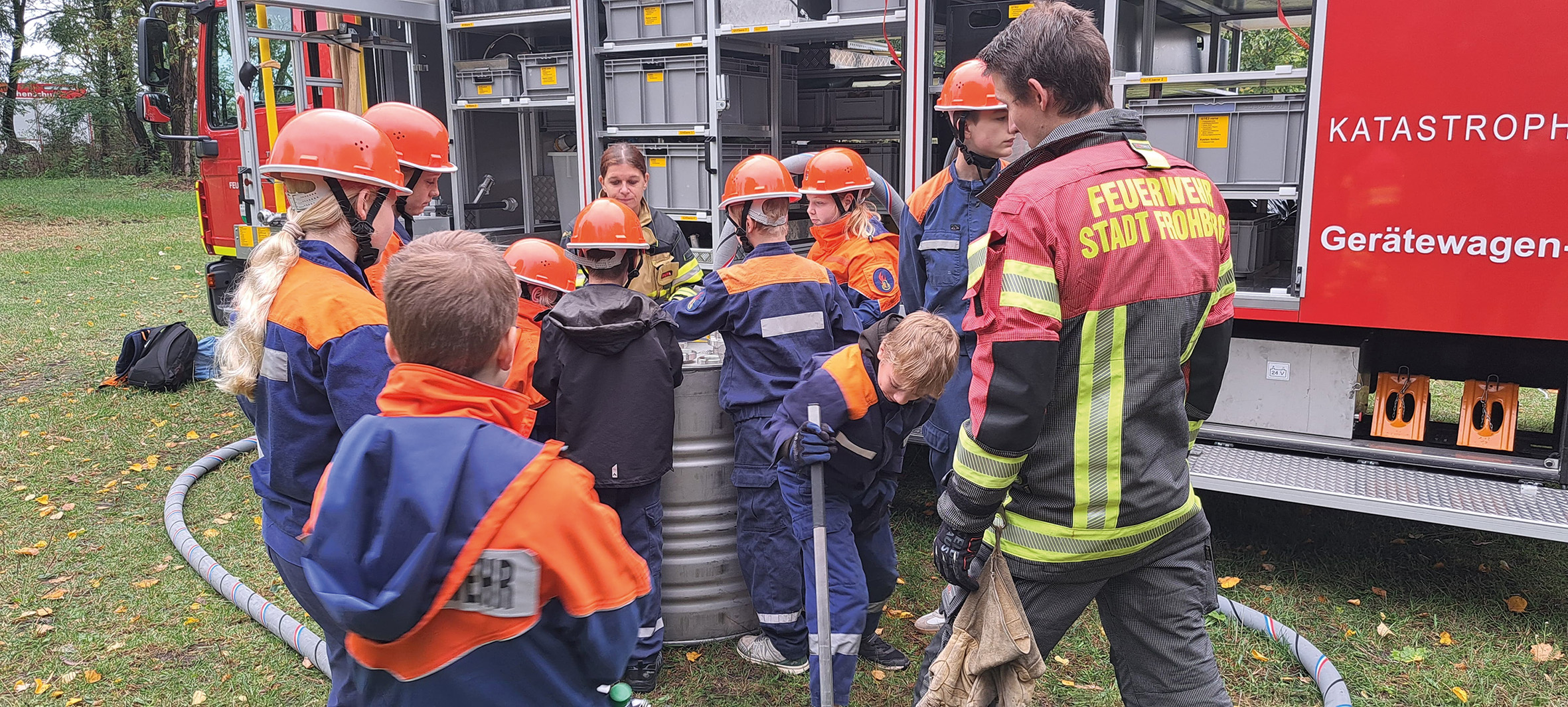 Am Samstag, den 27.09.2025 trafen sich 58 Kinder und Jugendliche sowie 22 Jugendwarte und Betreuer an der Neuholländermühle in Wyhra zum gemeinsamen jährlichen Ausbildungstag. Die Jugendfeuerwehren Borna, Eula, Thräna, Neukirchen, Wyhra und Zedtlitz bereiteten insgesamt sechs Stationen vor, an denen die Jungen Brandschützer ihr Können beweisen und natürlich einiges lernen konnten. So wurden die Erste Hilfe und das Schlauchmanagement genauso geübt wie die Handhabung der Funkgeräte, der Umgang mit tragbaren Leitern und das Binden der Knoten. Mit besonderer Aufmerksamkeit wurde das Thema Notruf und die Personenrettung aus Fahrzeugen verfolgt. Feuerwehren werden immer öfters zu Verkehrsunfällen gerufen, wo eine umfangreiche technische Hilfeleistung erfolgt. Hierbei gibt es einiges zu beachten, was von den Ausbildern anschaulich erklärt wurde. Ein Highlight war die Vorstellung vom Gerätewagen-Gefahrgut der Feuerwehr Frohburg. Dieses Fahrzeug hat eine spezielle Ausrüstung zur Bekämpfung, Eindämmung und Beseitigung verschiedenster gefährlicher Stoffe an Bord. Die jungen Brandschützer stellten sehr interessiert unzählige Fragen, welche von den Frohburger Kameraden umfangreich und altersgerecht beantwortet wurden.