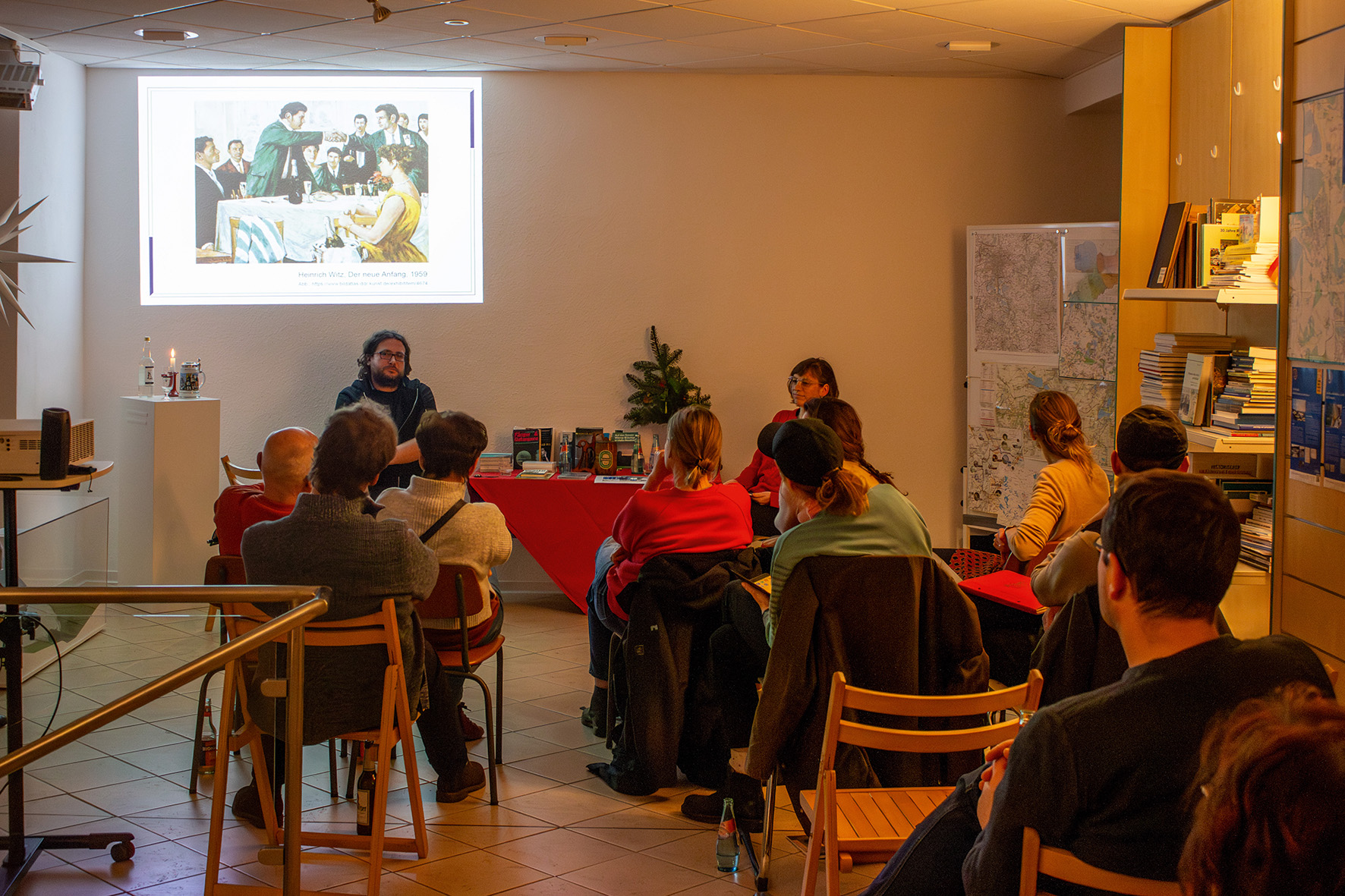 Den Schwerpunkt bildeten dabei zwei Gesprächsabende unter dem Titel „Einladung zum Betriebsvergnügen“, bei denen Zeitzeugnisse wie Brigadebücher, Fotografie, Literatur, Kunst, Musik und Objekte wie Biergläser, Bierdeckel und Trinkbranntweinflaschen, aber auch eigene Erfahrungen zu Arbeitskultur, Feiern und Alkoholkonsum in der DDR thematisiert und diskutiert wurden. Gab es einen besonderen Umgang mit Alkohol in der Bergbauarbeit? Unterschieden sich Arbeitsfeiern zwischen Ost und West? Ist eine Feierkultur verloren gegangen? Wie feiern wir heute?