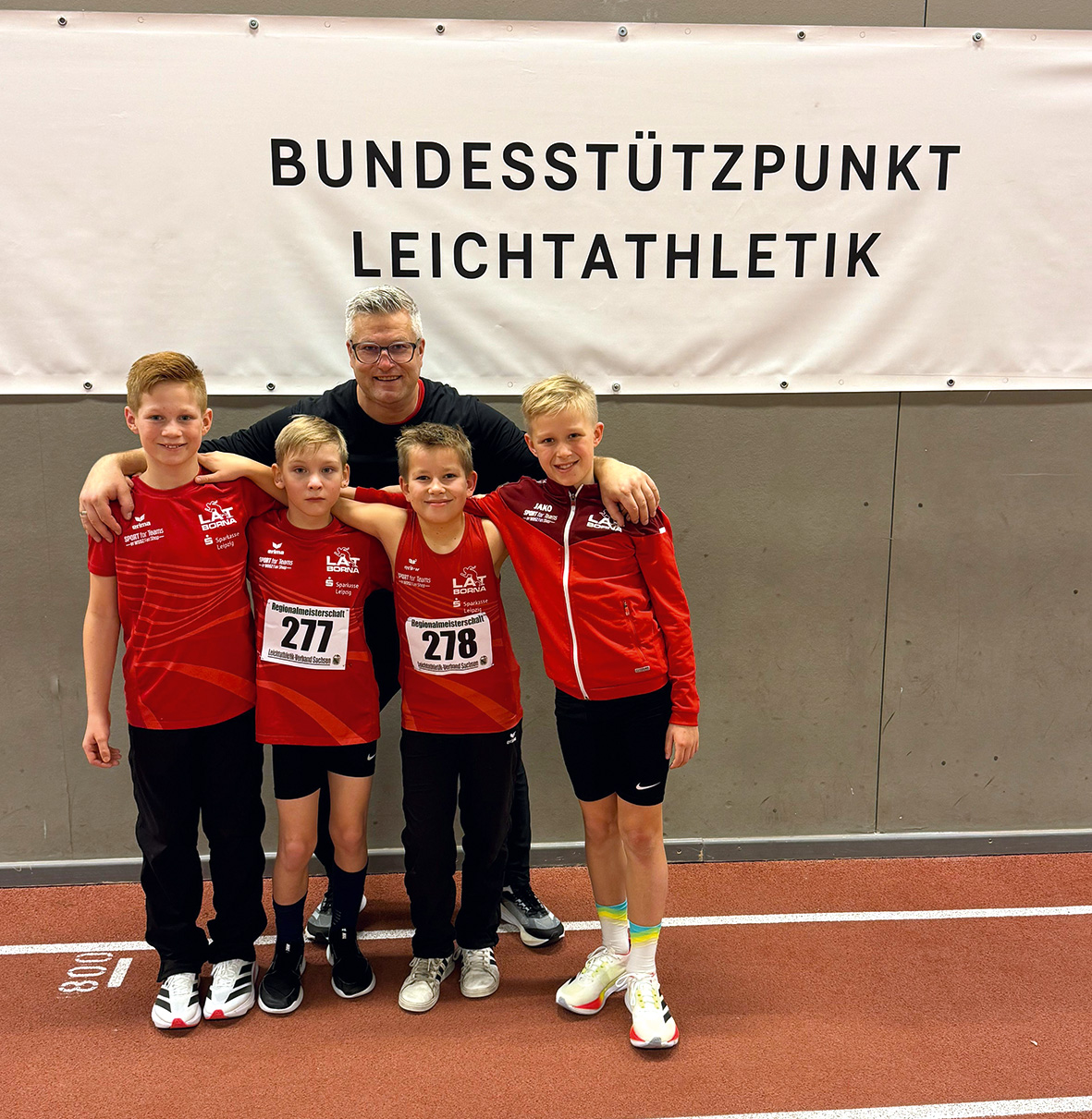 Der erste Wettkampf im neuen Jahr verlief gleich sehr erfolgreich für das Leichtathletik-Team Borna. Bei der Regionalmeisterschaft Leipzig am 11. Januar 2026 konnten die Jungs der U12 ihren Mannschaftstitel im Fünfkampf aus dem Vorjahr verteidigen. Ben und Tim Nöbel konnten in der Halle an der Leipziger Nordanlage gemeinsam mit Richard Neugebauer die erste Mannschaft des SC DHfK Leipzig um knappe 90 Punkte auf den Silber-Rang verweisen. Die gleichaltrigen LAT-Mädchen belegten den beachtlichen 12. Platz von 25 Teams. In der Einzelwertung schnappte sich Tim Nöbel besonders Dank 9,8 sec über 60 m Hürden und 7,3 sec im 50 m-Sprint den Regionalmeistertitel der M11. Sein Bruder Ben machte mit Silber den Bornaer Doppelsieg komplett. In der M10 verpasste Richard Neugebauer um gerade einmal 35 Punkte die Medaillenränge und wurde starker Vierter. Beste weibliche Starterin aus Borna war Leonie Suntrop in der W11. Von 48 Starterrinnen erkämpfte sie sich mit starken persönlichen Einzelleistungen den 12. Platz.