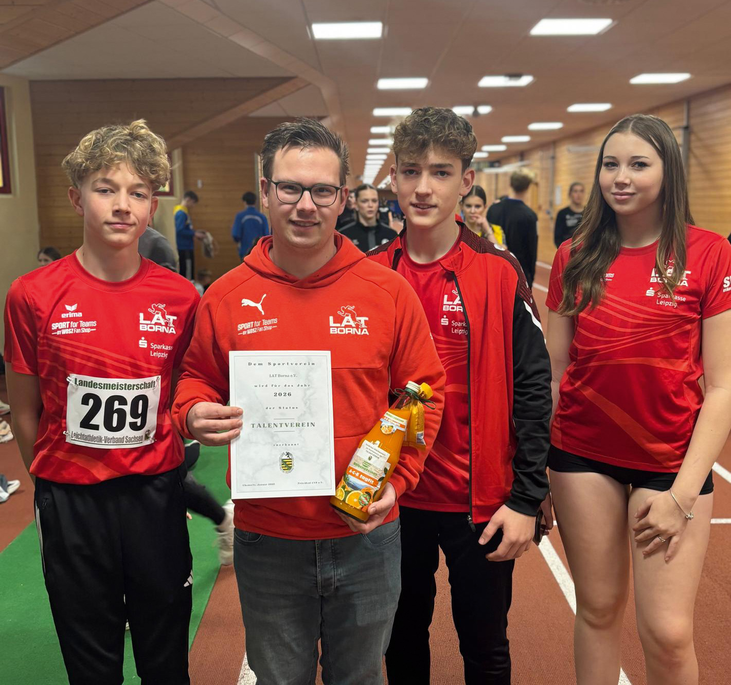 Am 17.01. startete in Chemnitz Constantin Mewes für das LAT Borna in der M14 gleich mit einer neuen persönlichen Bestzeit über die 60 m in die Hallenlandesmeisterschaftssaison der U16. Großes Highlight für den Bornaer Athleten war im Anschluss noch Platz 5 im Kugelstoßen - ebenfalls mit neuer Bestleistung. In einem weiteren engen Kugelstoßwettkampf sicherte sich Belinda Borella in der W14 mit 9,71 m aus dem vorletzten Stoß den Bronzerang. Die gleichaltrige Bornaer Sportlerin Lotta Förster - seit diesem Jahr für den TSV Kitzscher startend - konnte mit einem starken ersten Stoß von 9,78 m im ersten Versuch Silber gewinnen. Im Rahmen des Wettkampfes wurde das LAT ebenfalls als Talenteverein 2026 vom Leichtathletik Verband Sachsen ausgezeichnet. Grund hierfür die 6 E-Kader-Athleten der Mittleren Gruppe aus dem Vorjahr. Am 07.02. wiederum fanden in Chemnitz die Landeshallenmeisterschaften der Senioren statt. Das LAT war in den jüngsten Altersklassen mit den beiden Trainern der Großen Gruppe vertreten. Carlo Hohnstedter sicherte sich im Dreisprung mit soliden 10,00 m den Landesmeistertitel in der M30 und Stefan Lindstedt errang Doppel-Silber mit 2:35min über 800 m sowie im Kugelstoßen der M35.