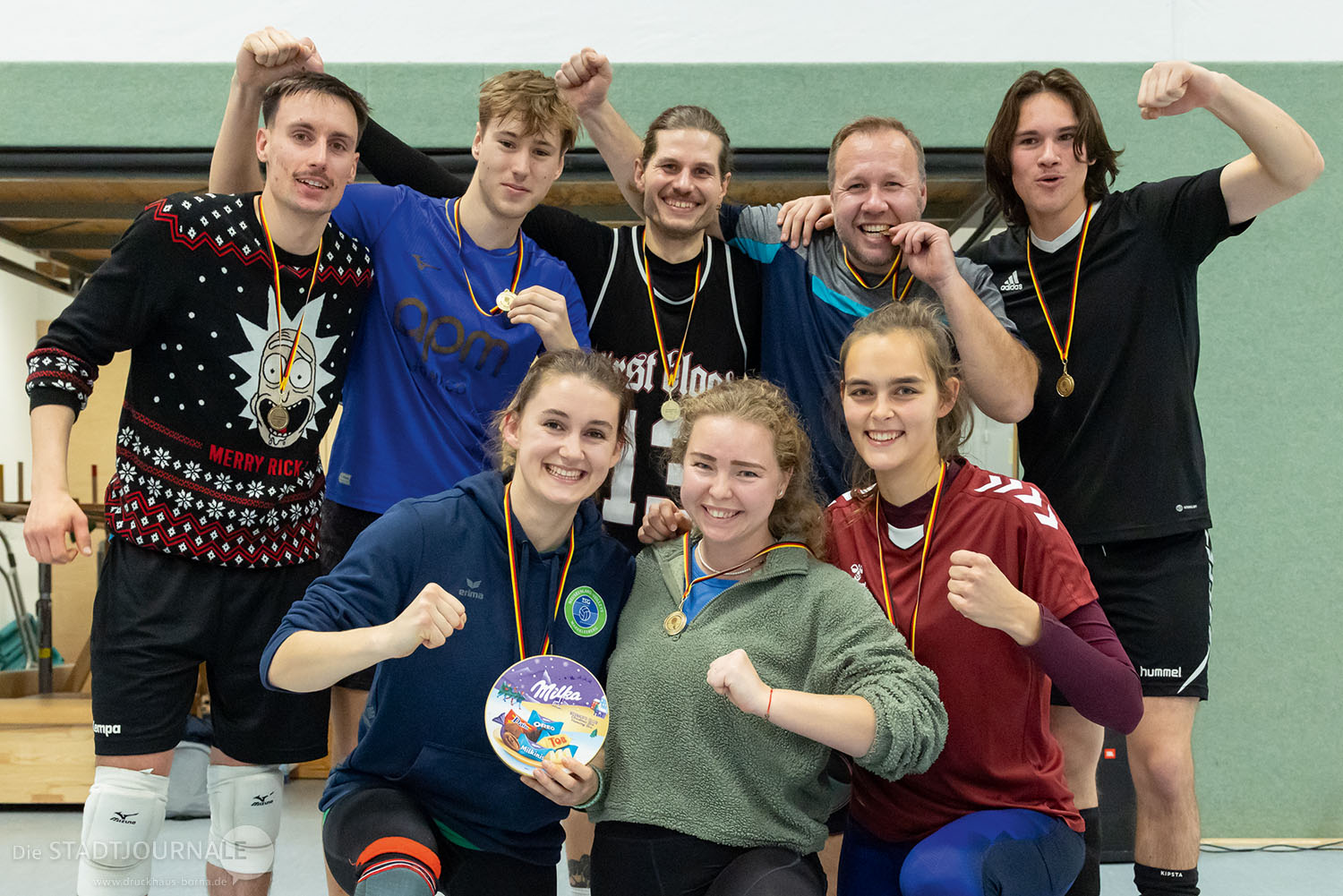 Traditionell stimmungsvoll ging es beim Weihnachtsvolleyballturnier der TSG Markkleeberg zu. Am 16. Dezember nahmen 92 Aktive in der Neuseenlandhalle teil. In zehn gelosten Teams – jeweils mit einer gesetzten Spielerin und einem Spieler aus den 1. Mannschaften – lieferten sich die Teilnehmenden spannende und ausgeglichene Spiele. Den Turniersieg holte sich „Merry Rick-mas“ mit Pauline Meyer aus der 1. Damen vor dem Team von Hannah Buß, verstärkt durch Hallensprecher Thomas Michael. Herzlichen Glückwunsch!