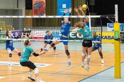 Satz 2 sollte nun die Wende bringen, doch er ging leider zunächst „nach hinten los“. Zwei frühe Auszeiten von Tim Reichenbach bei 2:6 und 3:9 änderten erstmal auch nichts an der klaren Führung der Dresdnerinnen von bis zu fünf Punkten. Doch ab der Satzmitte wurden unsere Mädels wieder stabiler und bei den Gästen schlichen sich dann doch auch mal ein paar Fehler ein. Der Punktrückstand verringerte sich so kontinuierlich und bei 23:23 war sogar der Ausgleich geschafft. Aber leider versäumten es unsere Mädels dann, sich mit dem Satzgewinn zu belohnen. Ein dankbar angenommenes Annahmegeschenk und ein Hammerangriff brachten den Gästen leider den denkbar knappen 25:23-Satzerfolg.