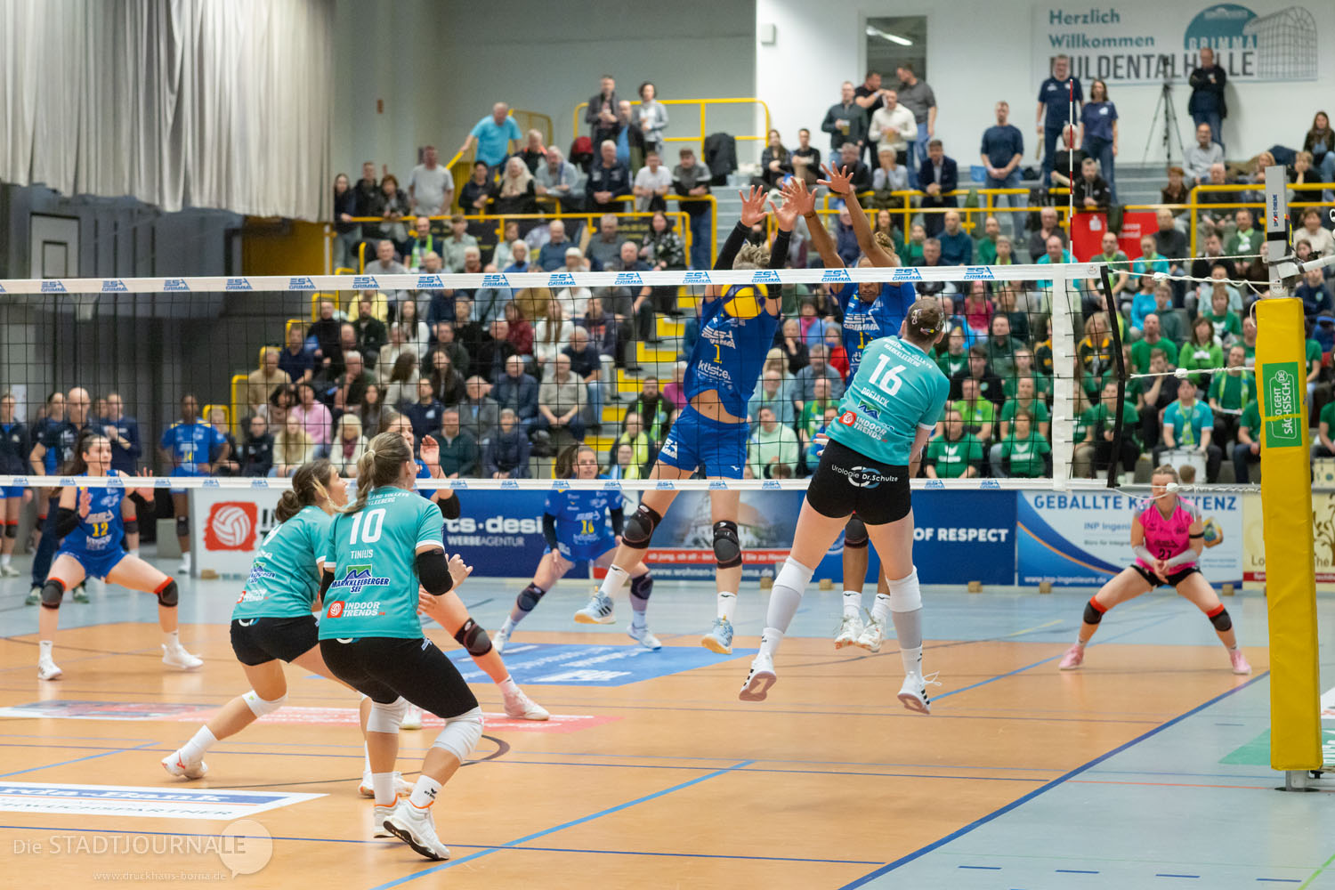 In Satz 1 war zwar die „grüne Wand“ der Fans (ähnlich wie einst in der Brüderhölle) voll da, aber bei den Mädels auf der Platte klappte (zu) wenig, bei den Gastgeberinnen hingegen nahezu alles. Vor allem die Annahme der zugegebenermaßen guten Aufgaben der Grimmaerinnen bekamen unsere Mädels nicht in den Griff, und so kassierten sie einen ziemlich heftigen und schnellen11:25-Satzverlust. Gejubelt und angefeuert wurde trotzdem unverdrossen. Und auch mein (sicher optimistischer) Tip, wir verlieren Satz 1, gewinnen aber das Spiel 3:2, konnte noch in Erfüllung gehen.