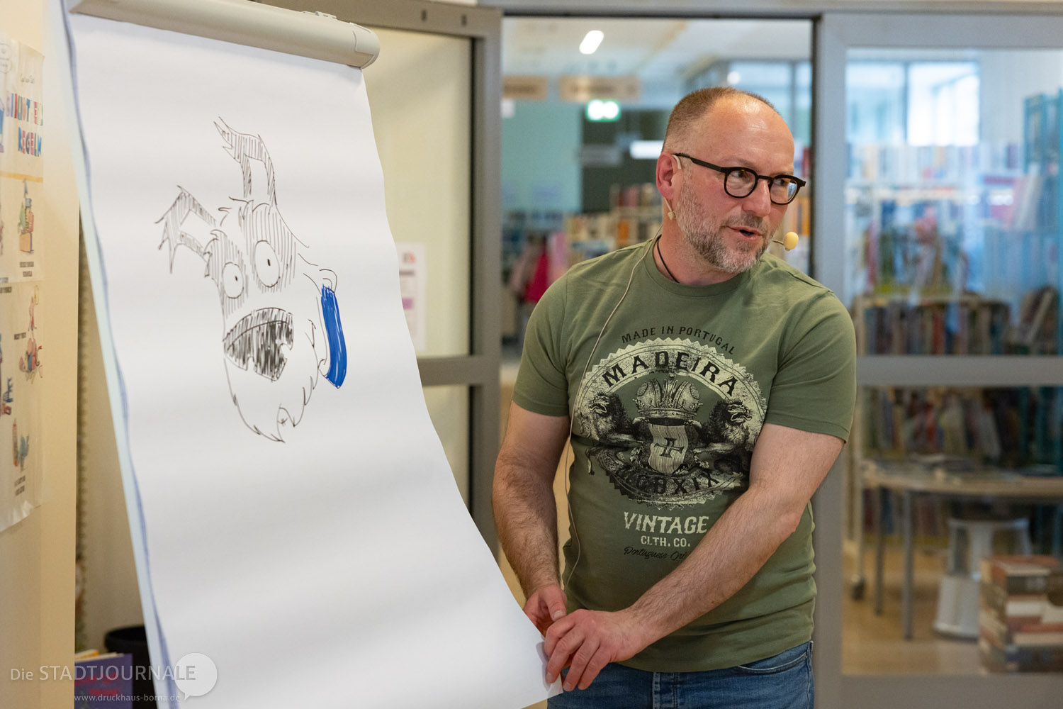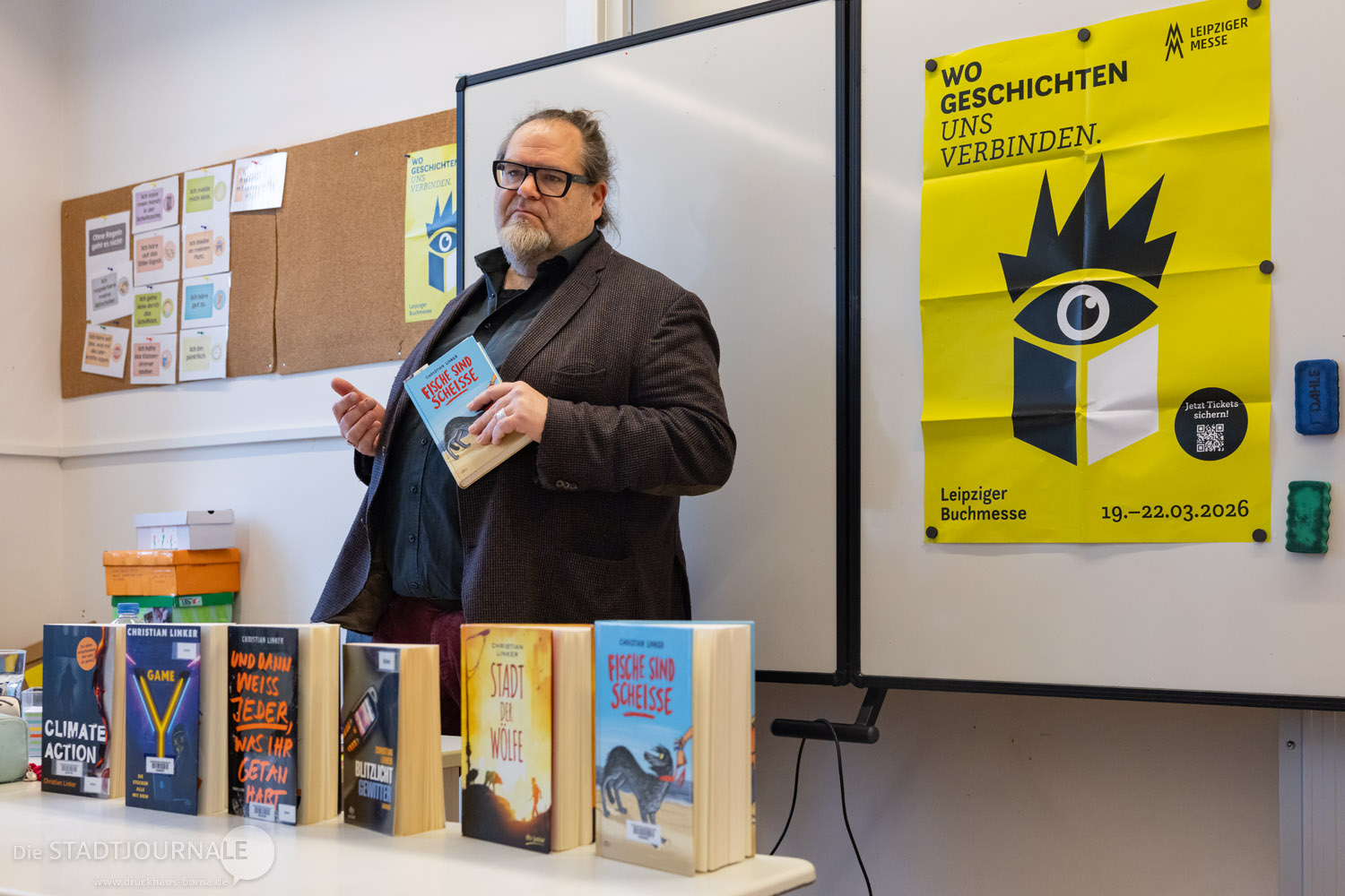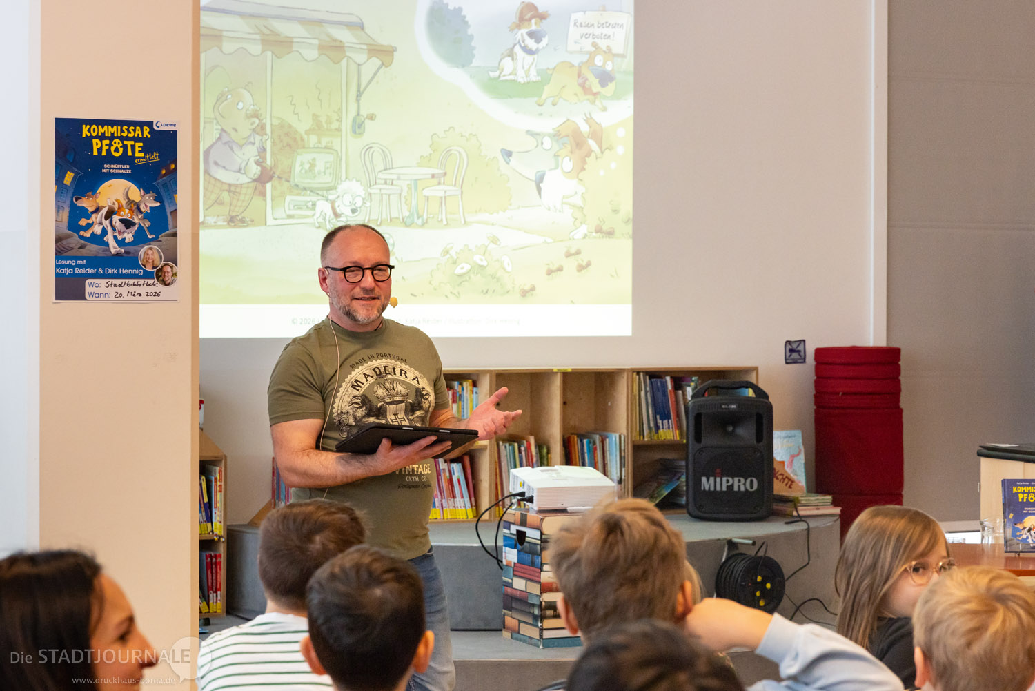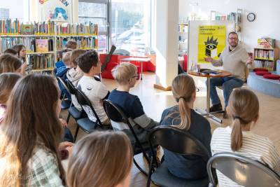 Auch junge Leserinnen und Leser kamen nicht zu kurz. Am Donnerstagvormittag entführte der Autor Boris Koch eine 5. Klasse der Rudolf-Hildebrand-Schule in „Die Schule des Schreckens“ (Woow Books). Am Freitag war die Stadtbibliothek mit Christian Linker und seinem Buch „Fische sind scheiße“ (dtv) zu Gast im Klassenzimmer der Klasse 5a an der Oberschule. Parallel dazu erweckte Dirk Hennig den „Kommissar Pfote“ (Loewe) für Kinder der Grundschule West zum Leben – der Illustrator las nicht nur, er zeichnete auch live die Hauptfiguren.
