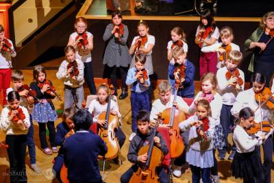 Den Auftakt des Konzertes gestaltete das Nachwuchsstreichorchester gemeinsam mit Kindern der Grundschule Markkleeberg-West, die im Rahmen des dortigen Ganztagesangebotes Unterricht bei Pädagoginnen und Pädagogen der Musikschule erhalten. Das schwungvolle freudige gemeinsame Musizieren der über 60 jungen Musiker begeisterte das Publikum vom ersten Ton an und war ein klingender Beweis für die gelungene jahrzehntelange Kooperation zwischen den beiden Einrichtungen.