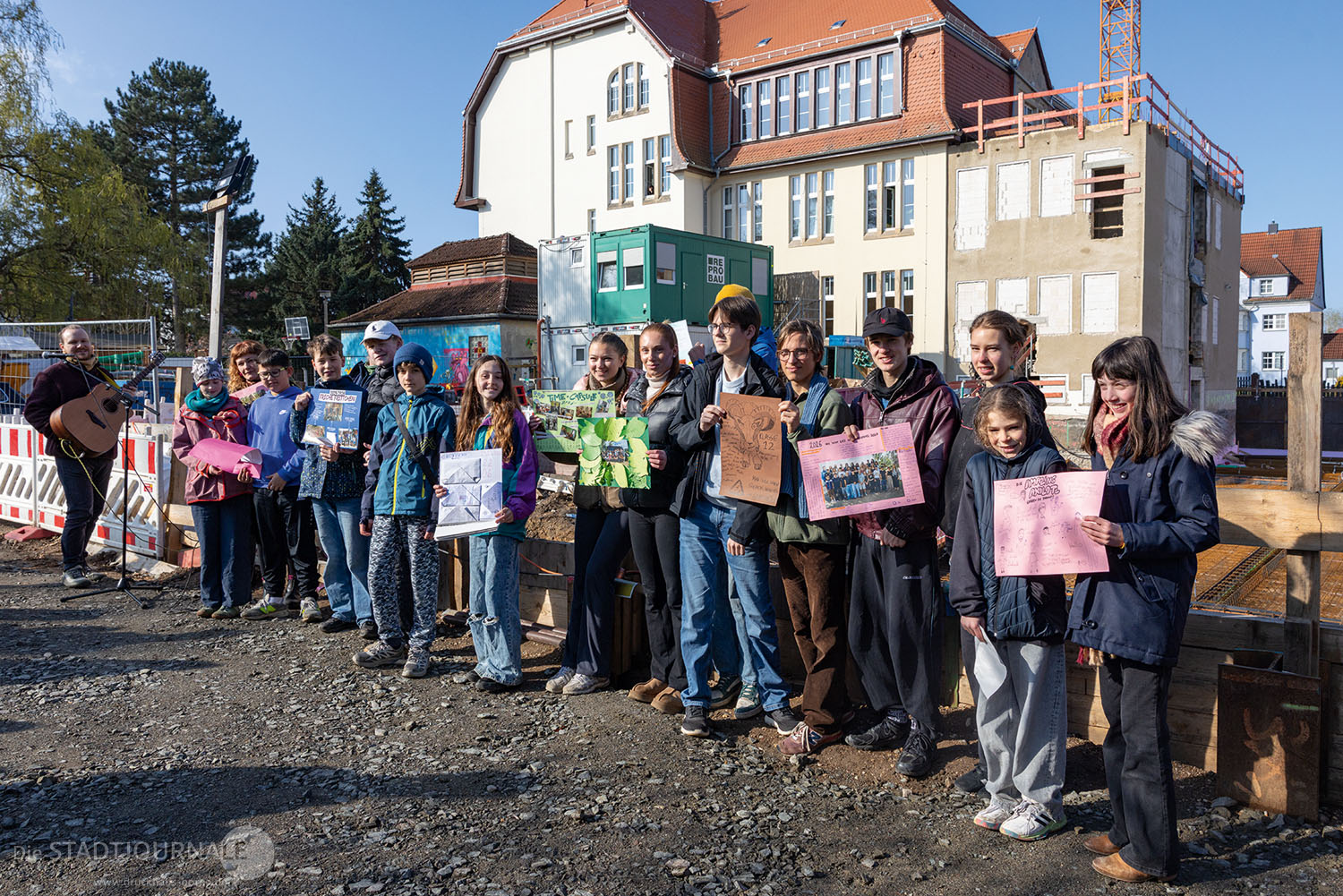 Schülerinnen und Schüler jeder Klasse gestalteten Plakate mit einer Botschaft an die Menschen in der Zukunft. Diese, die aktuelle Tageszeitung, die Baupläne der Schule sowie der Text der Fürbitte der Andacht wurden anschließend in einer Messinghülse eingeschlossen und im Fundament des Schulneubaus eingelassen. Mit einem Eis – das freundlicherweise vom Backhaus Hennig zur Verfügung gestellt wurde – fand der symbolische Akt der Grundsteinlegung für alle Schülerinnen und Schüler einen fröhlichen Ausklang.