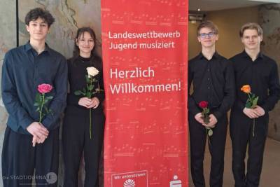 Über dieselbe Punktzahl konnte sich auch das Percussionensemble mit Leonore Scheibe, Jakob Hölzel, Theo Schulze und Giulio Berger freuen. Es erreichte in der Kategorie Neue Musik (Altersgruppe IV, 15 bis 16 Jahre) 24 Punkte, erhielt einen 1. Preis und wurde zudem zum Bundeswettbewerb in München und Regensburg weitergeleitet. In der Altersgruppe II, in der das Querflötenquartett antrat, ist eine Weiterleitung zum Bundeswettbewerb noch nicht möglich.