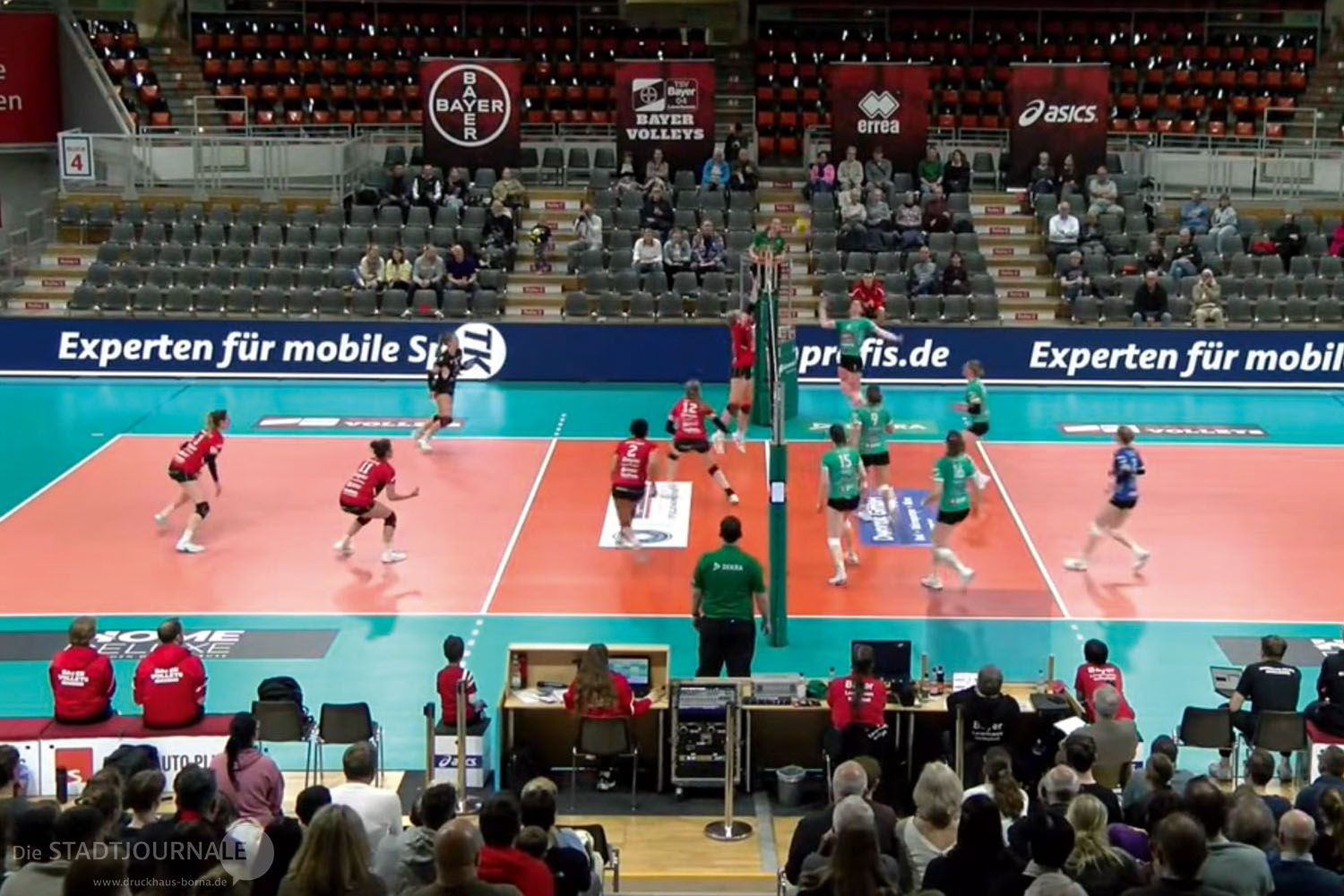 Und das Trainerfazit? „Was für ein toller Abend mit einem Ergebnis, mit dem man wohl kaum rechnen konnte!“, freute sich Trainer Tim Reichenbach zurecht und ergänzte: „Mit leicht veränderter Startaufstellung begann das Spiel aus unserer Sicht wirklich überzeugend. Wir haben uns taktisch auf Leverkusen eingestellt und wussten vor allem aus dem Hinspiel, was wir besser machen mussten. Mit guten Aufschlägen und einem sehr variablen Angriffsspiel schafften wir es, gerade zum Spielbeginn einen sehr dominanten Auftritt hinzulegen. Nicht zu vergessen sind an der Stelle zahlreiche kämpferische Abwehraktionen des Teams um eine stark spielende Salome Seidel auf der Liberoposition. Leider verloren wir ab Satz 3 dann ein bisschen den Faden. Sobald Leverkusen den Druck erhöhte, verloren wir leider zu schnell das Selbstvertrauen in die eigenen Fähigkeiten und machten zu viele eigene Fehler.