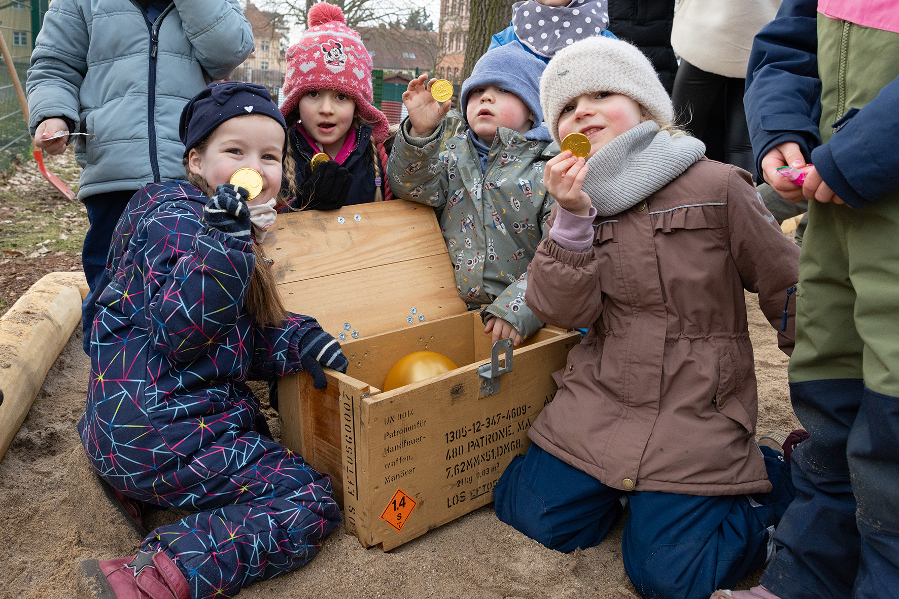 Am 11. Februar 2025 war es dann endlich soweit und das lange Warten hat sich gelohnt: Mit Gesang, Saft zum Anstoßen und einem großen Dankeschön an die Stadt Markkleeberg, die die Finanzierung übernommen hatte, wurde die Einweihung der Spielgeräte gefeiert. Mit viel Freude durften die Kinder unserer Kita dann auch endlich das Absperrband eigenhändig mit der Schere zerschneiden, die neuen Spielgeräte in Beschlag nehmen und einen versteckten Schatz ausheben.
