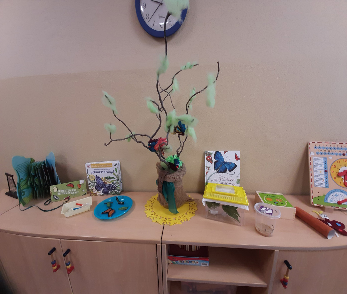 Besonders interessant war bei diesem Projekt zu beobachten, wie aus klitzekleinen lebenden Raupen wunderschöne Schmetterlinge entstanden. Dabei konnten die Kinder die verschiedenen Entwicklungsstadien eines Schmetterlings in einem Terrarium beobachten und freuten sich am Ende der Entwicklung über wunderschöne Schmetterlinge, die wir in der Natur frei ließen.