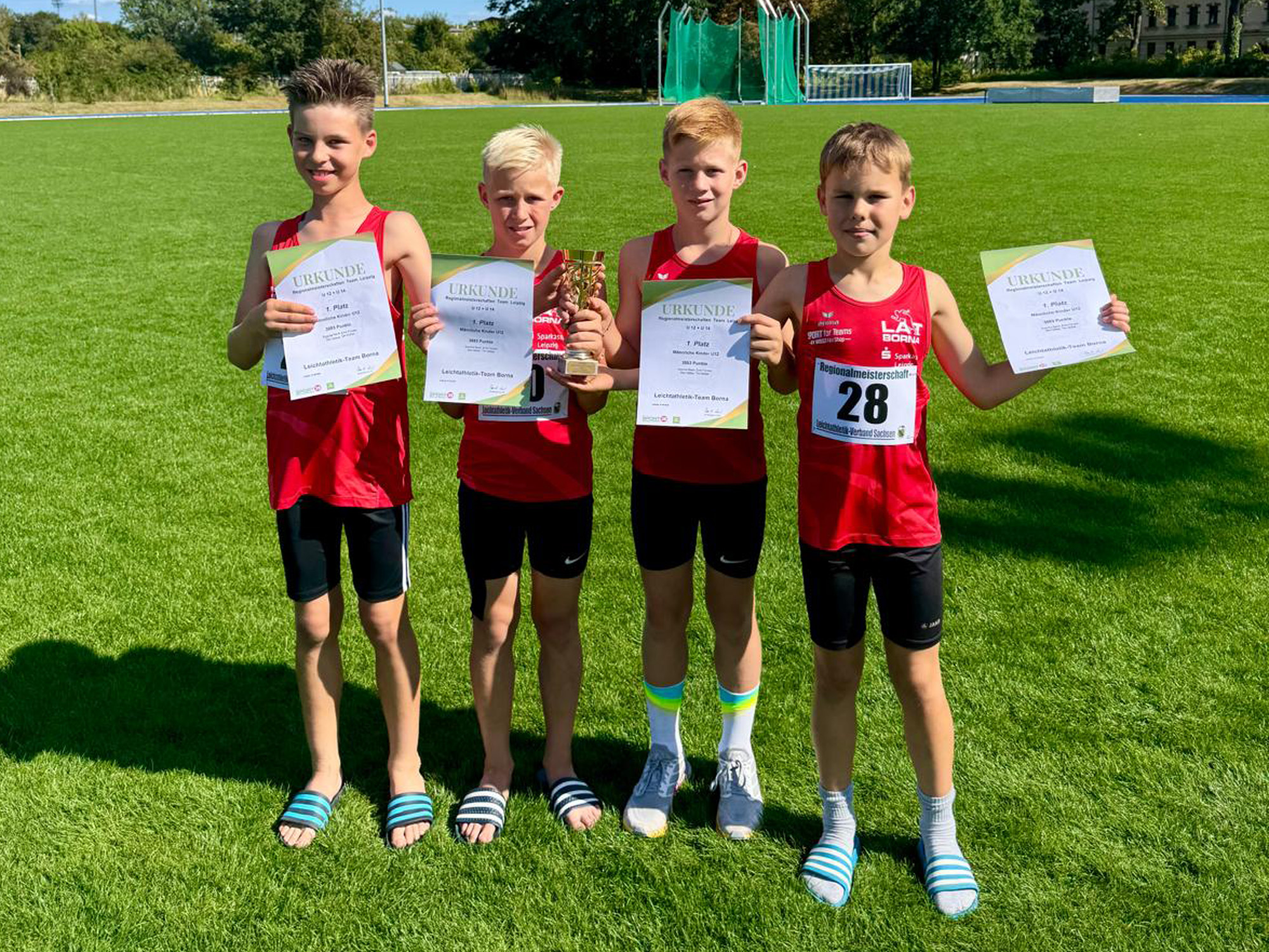 Die U12-Jungen des Leichtathletik-Team Borna zählen zu den aufstrebenden Mehrkämpfern im Landkreis Leipzig. Emil Förster, Sascha Bach sowie Tim und Ben Nöbel sicherten sich in der Halle den Leipziger Regionalmeistertitel im Fünfkampf, zugleich den höchsten Mannschaftstitel dieser Altersklasse.