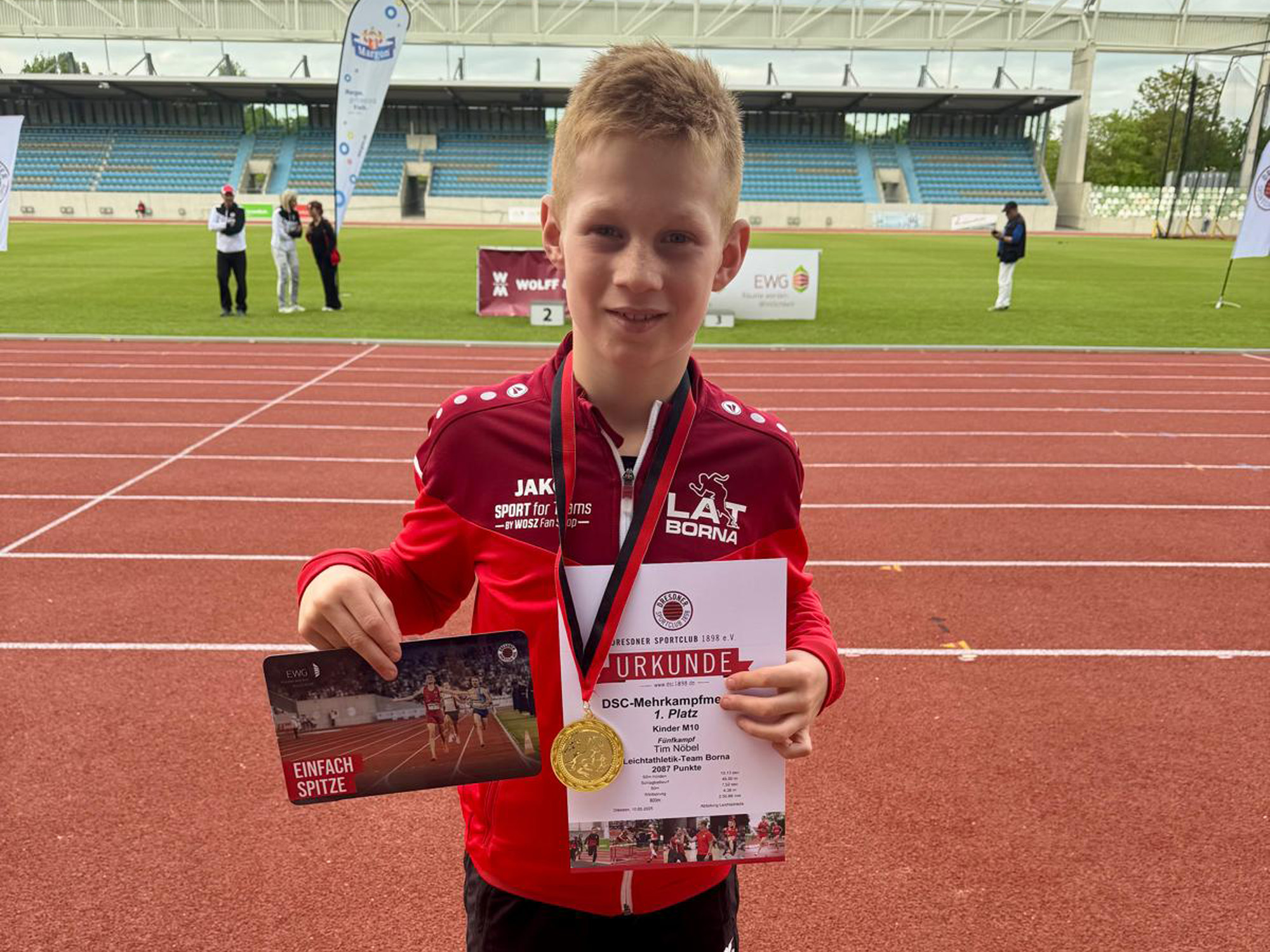 Tim Nöbel startet für das Leichtathletik-Team Borna. Seit fast vier Jahren trainiert er gemeinsam mit seinem Zwillingsbruder, inzwischen zweimal pro Woche. Bei den Landesjugendspielen gewann er fünfmal Gold und einmal Silber. 2025 brach er zweimal den sächsischen Fünfkampf-Landesrekord und sammelte Podestplätze bundesweit.