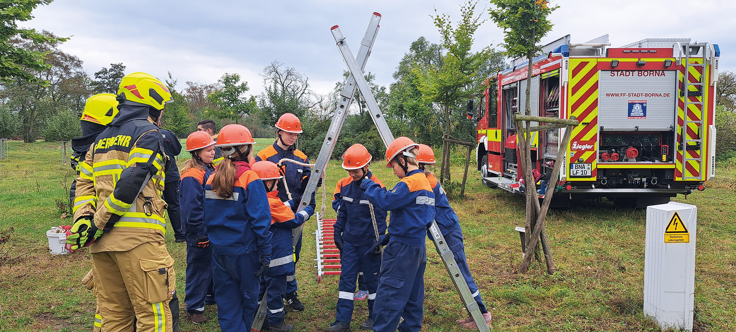Am Samstag, den 27.09.2025 trafen sich 58 Kinder und Jugendliche sowie 22 Jugendwarte und Betreuer an der Neuholländermühle in Wyhra zum gemeinsamen jährlichen Ausbildungstag. Die Jugendfeuerwehren Borna, Eula, Thräna, Neukirchen, Wyhra und Zedtlitz bereiteten insgesamt sechs Stationen vor, an denen die Jungen Brandschützer ihr Können beweisen und natürlich einiges lernen konnten. So wurden die Erste Hilfe und das Schlauchmanagement genauso geübt wie die Handhabung der Funkgeräte, der Umgang mit tragbaren Leitern und das Binden der Knoten. Mit besonderer Aufmerksamkeit wurde das Thema Notruf und die Personenrettung aus Fahrzeugen verfolgt. Feuerwehren werden immer öfters zu Verkehrsunfällen gerufen, wo eine umfangreiche technische Hilfeleistung erfolgt. Hierbei gibt es einiges zu beachten, was von den Ausbildern anschaulich erklärt wurde. Ein Highlight war die Vorstellung vom Gerätewagen-Gefahrgut der Feuerwehr Frohburg. Dieses Fahrzeug hat eine spezielle Ausrüstung zur Bekämpfung, Eindämmung und Beseitigung verschiedenster gefährlicher Stoffe an Bord. Die jungen Brandschützer stellten sehr interessiert unzählige Fragen, welche von den Frohburger Kameraden umfangreich und altersgerecht beantwortet wurden.