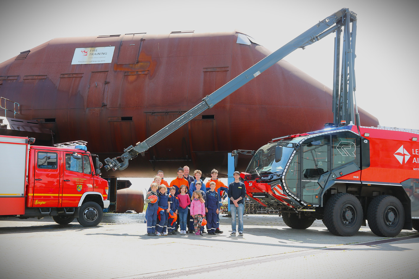 Als wir fast pünktlich um 10:00 Uhr am Trainingsgelände ankamen, wurden wir auch direkt in Empfang genommen und zwei spannende und interessante Stunden lagen vor uns. Zu Beginn versammelten wir uns im Schulungsraum, da wurde erst einmal erklärt, seit wann es die Flughafenfeuerwehr gibt, wie groß der Flughafen eigentlich ist, wie viele Menschen da arbeiten und was so alles zu den Aufgaben der Kameraden auf dem Flughafen gehört. Dies wurde durch die Kinder und Jugendlichen gespannt aufgenommen und es wurden noch viele offene Fragen beantwortet.