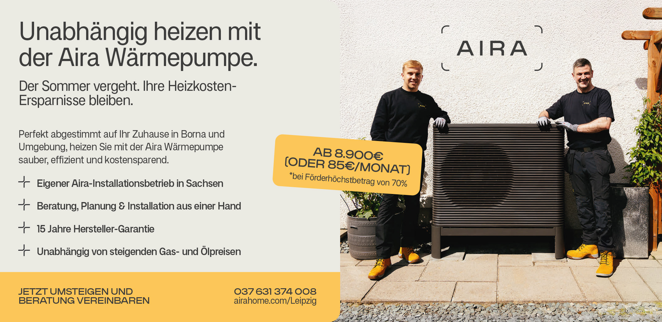 Deshalb bietet Aira ein Rundum-sorglos-Paket: Von der individuellen Energieanalyse über Fördermittelberatung bis zur fachgerechten Installation durch regionale Teams. Die speziell entwickelten Systeme sind optimal auf deutsche Haushalte abgestimmt. Dazu gibt es 15 Jahre Hersteller-Garantie, verbrauchsoptimierte Ökostromtarife und eine optionale Ratenzahlung, die den Umstieg planbar und bezahlbar macht.