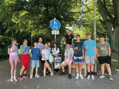 Den Auftakt machte am 16. Juni die 7. Klasse der Förderschule mit dem Förderschwerpunkt Lernen. Gemeinsam mit ihrer Lehrerin starteten etwa 16 Schülerinnen und Schüler am Busbahnhof und arbeiteten sich entlang der Bahnhofstraße vor. Mit großer Begeisterung und beeindruckender Eigeninitiative klebten sie die bunten Plakate auf die Mülleimer.