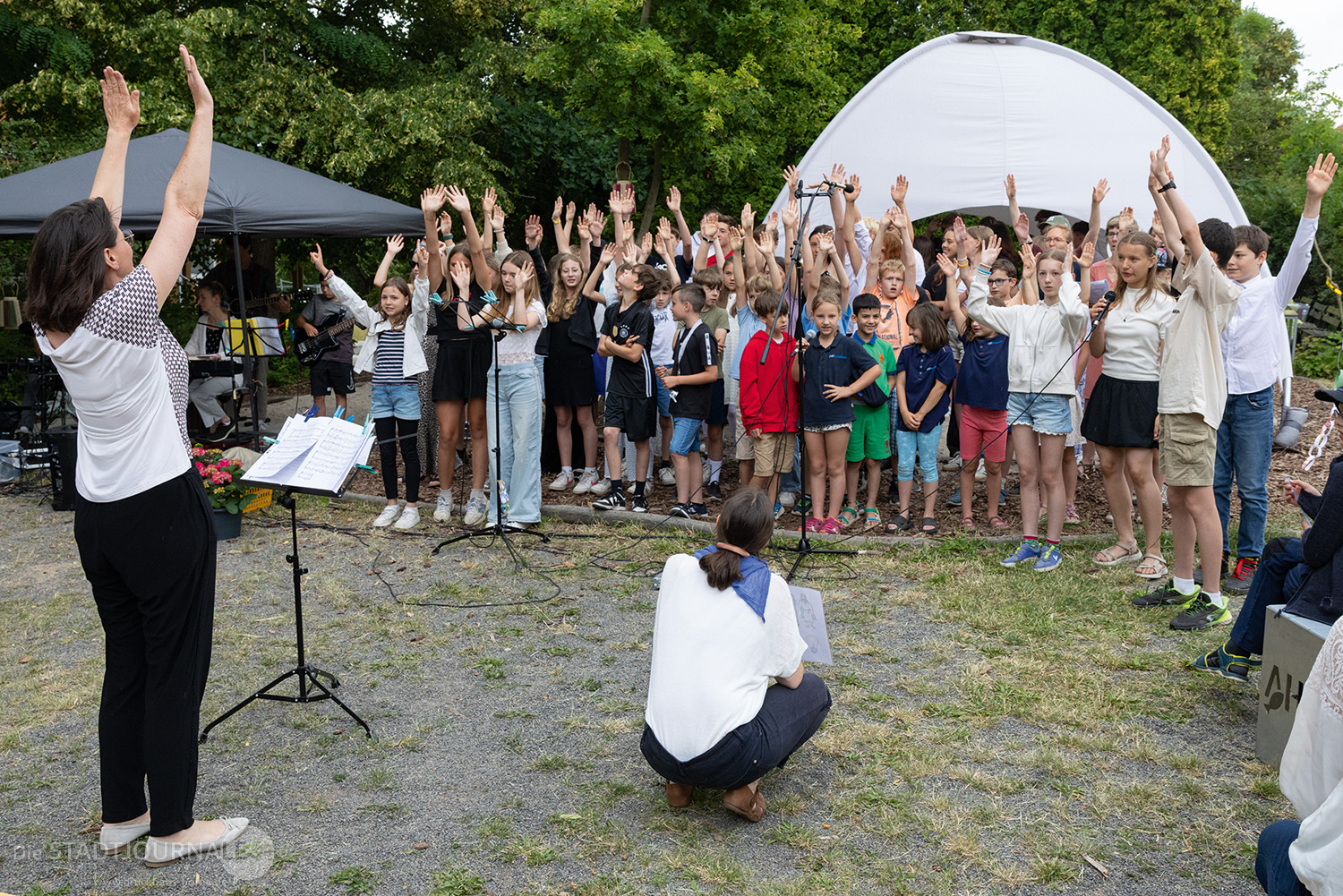 Zum Abschluss des ersten Schuljahres auf dem August-Hermann-Francke-Campus in der Koburger Straße wurde am 27. Juni 2025, dem letzten Schultag vor den Sommerferien, gefeiert. Los ging es um 11.00 Uhr mit einem Open-Air-Gottesdienst. Auch der Schulchor hatte dort seinen Auftritt. Für die symbolische Taufe des Schulfestes und des Schulcampus sorgte Petrus. So wurde die Veranstaltung kurzerhand nach drinnen verlegt. Dort blickte Steffen Schörner, der Vorstand des Trägervereins, auf das vergangene Jahr zurück, in dem mit dem Aufbau der Schulen eine unglaubliche Vision wahr geworden war. Er dankte allen Kolleg:innen, Eltern und Unterstützern, die dies mit ermöglicht hatten.