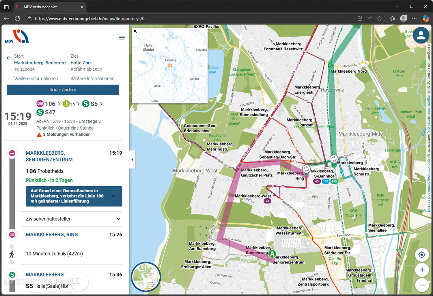 „Dieser Service verknüpft das ÖPNV-Angebot im Verbundgebiet mit der Lebenswelt der Fahrgäste und bietet eine Vielzahl von Infos auf einer Plattform“, betont MDV-Pressesprecherin Juliane Vettermann. „Die Verortung des Mobilitätsangebotes in einer Umgebungskarte ist praktisch für Gewohnheitsfahrer, besonders aber auch für Touristen oder Personen, die einen Trip in unbekanntes Terrain planen. Für uns als Verbund ist das ein nächster Schritt in Richtung einer leicht bedienbaren, digitalen Mobilitätsauskunft.“