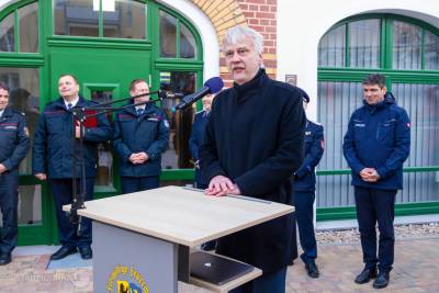 Landrat Graichen, der ebenfalls der Übergabe beiwohnte, ging auf die stattliche Einsatzzahl der Feuerwehren Markkleebergs ein. In diesem Jahr waren es bereits 196 Einsätze, welche sie absolvierten. Viele davon waren Brände auf der Deponie Cröbern. Bei jenen entzündeten sich oft die Akkus. „Nicht zu unterschätzen sind die Einsätze auf den Autobahnen A 38 und A 72“, so der Landrat weiter in seiner Ansprache. „Deshalb ist es wichtig, dass Markkleeberg eines der modernsten Feuerwehrgerätehäuser mit viel Platz für moderne Fahrzeuge hat.“ Sowohl dem Oberbürgermeister als auch dem Landrat war es wichtig, ihre Hochachtung gegenüber den Einsatzkräften auszusprechen, allzumal es eine Freiwillige Feuerwehr ist, welche solche enormen und gefährlichen Einsätze absolviert.