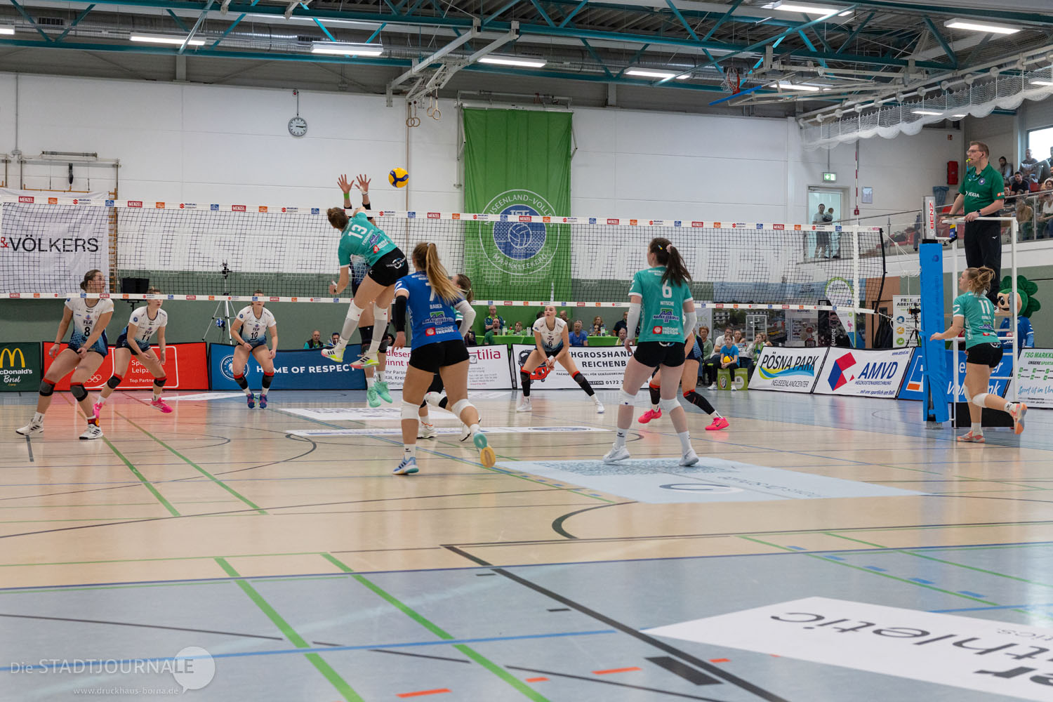 So eingestellt und mit den etwa 150 lauten Markkleeberger Fans in grün (auf die ist Verlass) im Rücken ging es dann ins Spiel, bei dem mit 512 Fans ein Zuschauerrekord in der Muldentalhalle aufgestellt wurde. In unserem Team fehlte die erste Zuspielerin Bianca leider krankheitsbedingt immer noch, so dass Unterstützung aus der Zweiten für Linda erfolgen musste. Nele Stuhr kam so zu ihrem ersten Einsatz 3 Ligen höher.