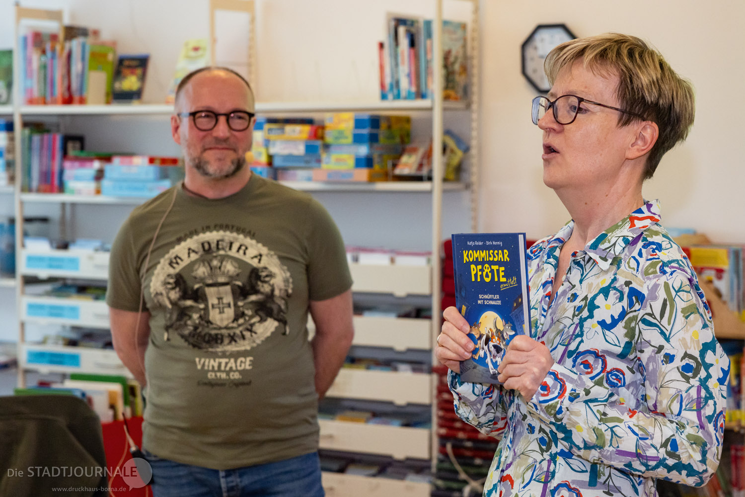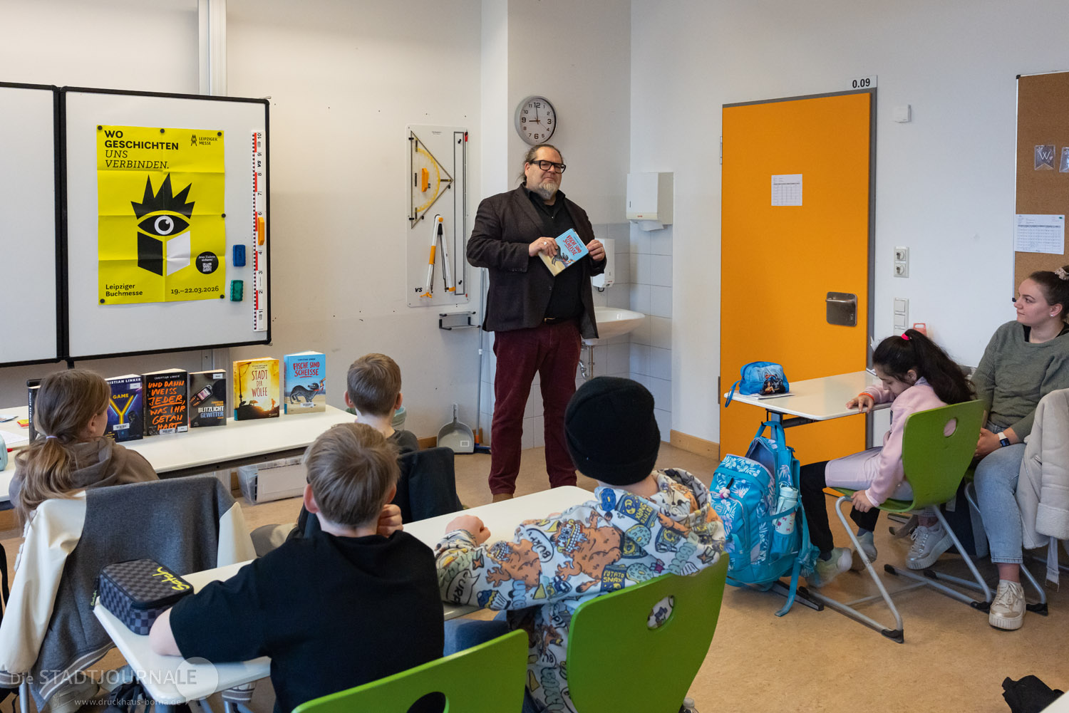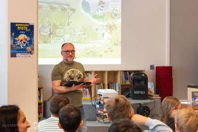 Auch junge Leserinnen und Leser kamen nicht zu kurz. Am Donnerstagvormittag entführte der Autor Boris Koch eine 5. Klasse der Rudolf-Hildebrand-Schule in „Die Schule des Schreckens“ (Woow Books). Am Freitag war die Stadtbibliothek mit Christian Linker und seinem Buch „Fische sind scheiße“ (dtv) zu Gast im Klassenzimmer der Klasse 5a an der Oberschule. Parallel dazu erweckte Dirk Hennig den „Kommissar Pfote“ (Loewe) für Kinder der Grundschule West zum Leben – der Illustrator las nicht nur, er zeichnete auch live die Hauptfiguren.