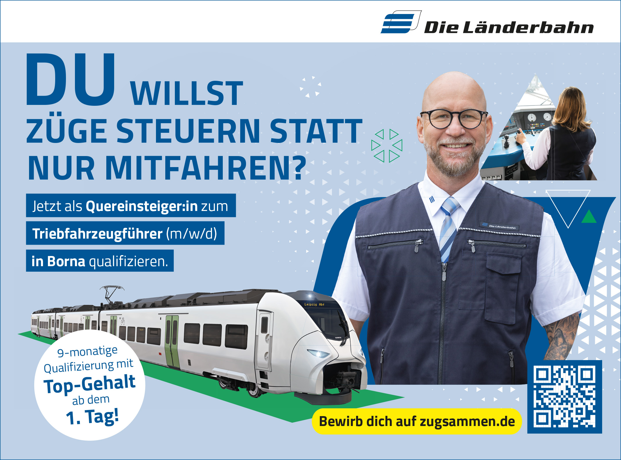 Für die Stadt Borna wird die Länderbahn ab Dezember 2026 nicht nur neue Mobilitätspartnerin werden. In Borna entsteht eine von insgesamt sieben neuen Meldestellen, wo die Fahrpersonale jeweils Dienstbeginn und Dienstende haben werden. Allein in Borna sind bereits jetzt mindestens 70 Arbeitsplätze zu vergeben. Gesucht werden u .a. Mitarbeitende für den Führerstand sowie Kunden- und Servicepersonal. Aufgrund von sehr langfristigen Verkehrsverträgen bietet die Länderbahn gut bezahlte und krisensichere Anstellungen in Borna. Für Fahrpersonale gilt ab 2026 außerdem die Wahlmöglichkeit zwischen einer 35-Stunden Woche bei vollem Lohnausgleich oder einer 40-Stunden Woche bei höherem Lohn. Neben Borna werden auch in Altenburg und Leipzig neue Personaleinsatzstellen entstehen.