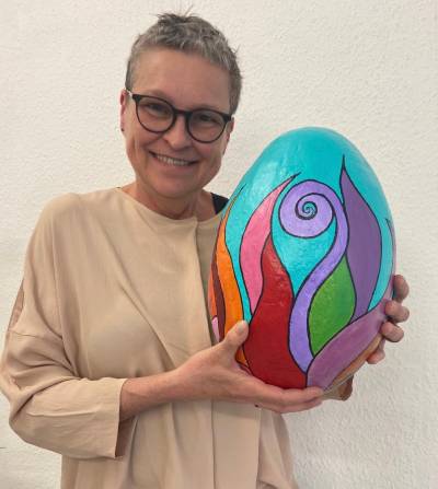 Das Eier-Bemalen hat sie nie losgelassen und darüber ihre Liebe zum Malen entdeckt. Was im Kleinen auf der zerbrechlichen Schale begann, hat sie später auf Pappe oder Leinwand übertragen.