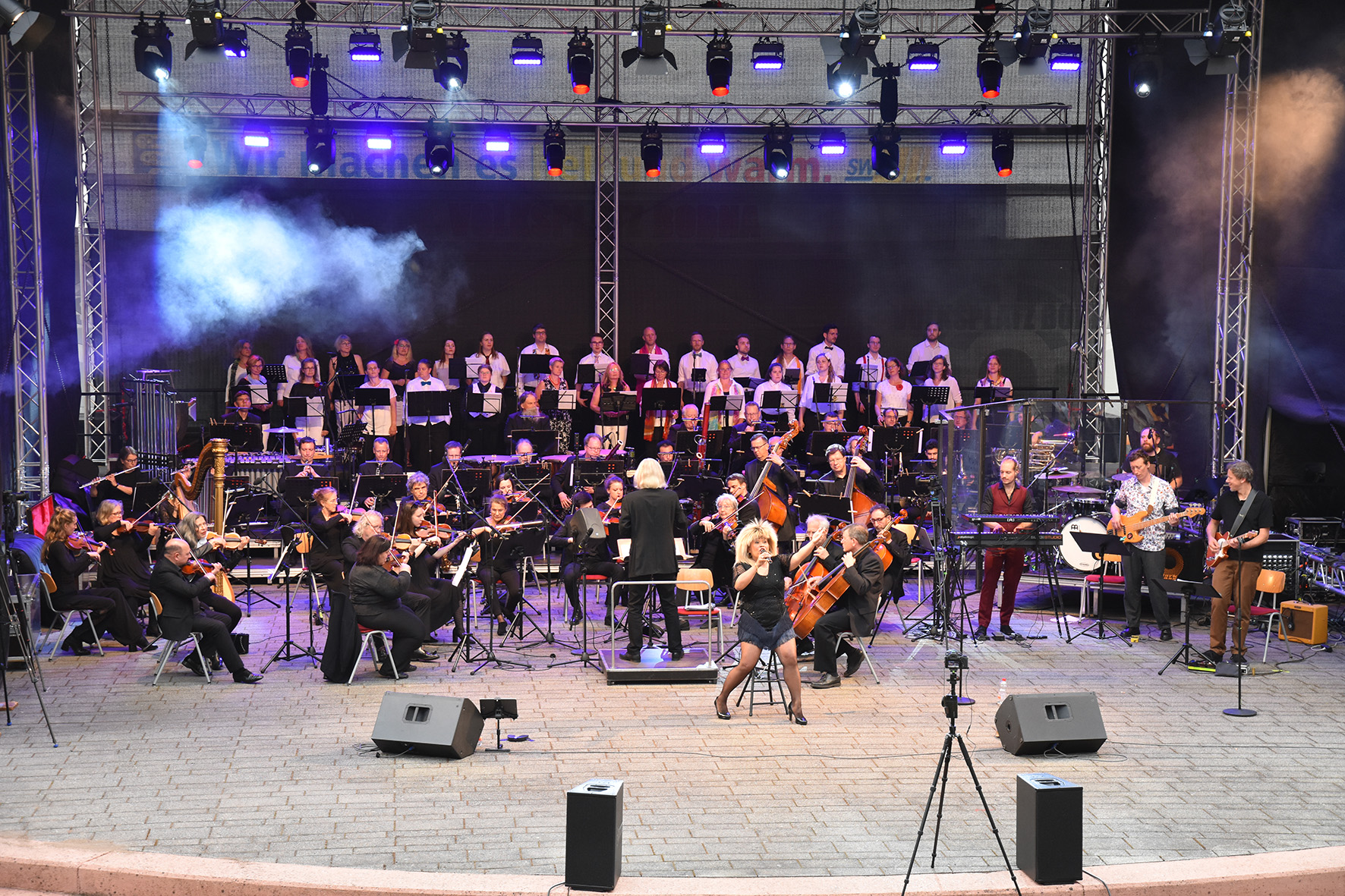 Das Leipziger Symphonieorchester stimmte die Gäste kunstvoll auf den Abend ein bevor David Bowie, dargestellt von Christopher Nell, bekannt aus der Hauptrolle im Bowie-Musical „Lazarus“ am Schauspielhaus Leipzig, dem Publikum richtig einheizte. Mit ihrer Power und Temperament brachte Josephine Pee von der Tina Turner Tribute Band den Volksplatz endgültig zum Kochen. Als würde Tina Turner leibhaftig auf der Bühne stehen, ertönten Klassiker wie „Simply the Best“ oder „GoldenEye“. Begleitet wurden die beiden Solisten sowie das Orchester erstmalig vom Konzertchor Leipzig und einer Rockband.