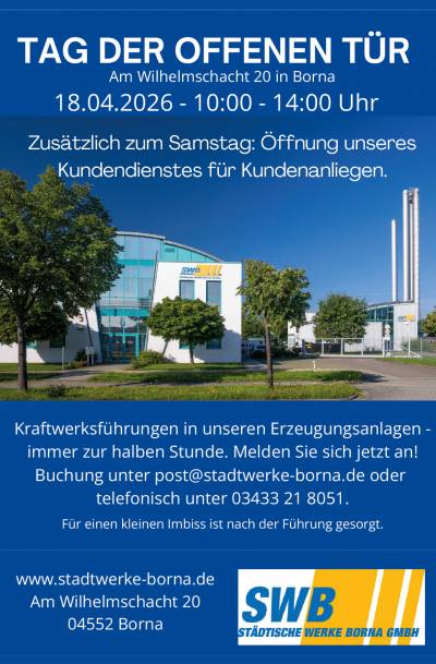 Die Städtische Werke Borna GmbH öffnet am 18. April von 10:00 bis 14:00 Uhr die Türen am Wilhelmschacht und lädt alle Interessierten zu spannenden Einblicken hinter die Kulissen ein. Erleben Sie Erzeugungsanlagen aus nächster Nähe und lassen Sie sich von Fachleuten durch die Technik führen.