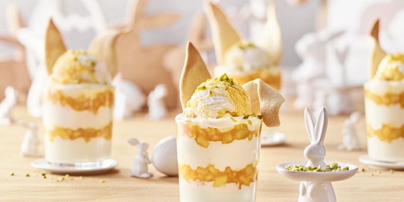 60 g Mehl, 20 g Zucker, 1 Prise Jodsalz, 25 g Margarine, 1 EL Milch, 300 g Magerquark, 2 Päckchen Vanillezucker, 2 Mangos, 6 Kugeln Cremissimo Mango-Maracuja Joghurt Eis
