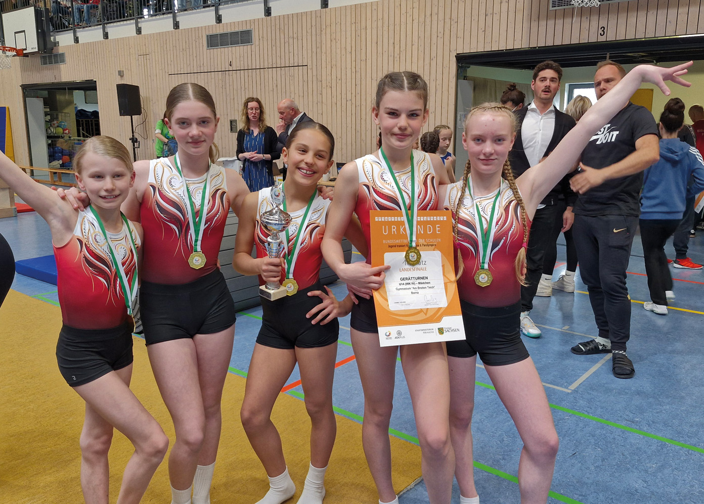 Nun hieß es Warten auf die Siegerehrung. Lehrer, Trainer und Turnerinnen wussten, dass nur der Sieg eine Qualifikation fürs Bundesfinale bedeuten würde. Die letzte Siegerehrung des Tages war der Altersklasse U14 weiblich zugordnet. Die Spannung konnte größer kaum sein – die Freude auch nicht. Tatsächlich schafften es die Schülerinnen des Bornaer Gymnasiums auf Platz 1 und damit dürfen sie ihre Schule und den Freistaat Sachsen beim Bundesfinale in Berlin vertreten. Ein grandioser und erstmaliger Erfolg der Turnerinnen!