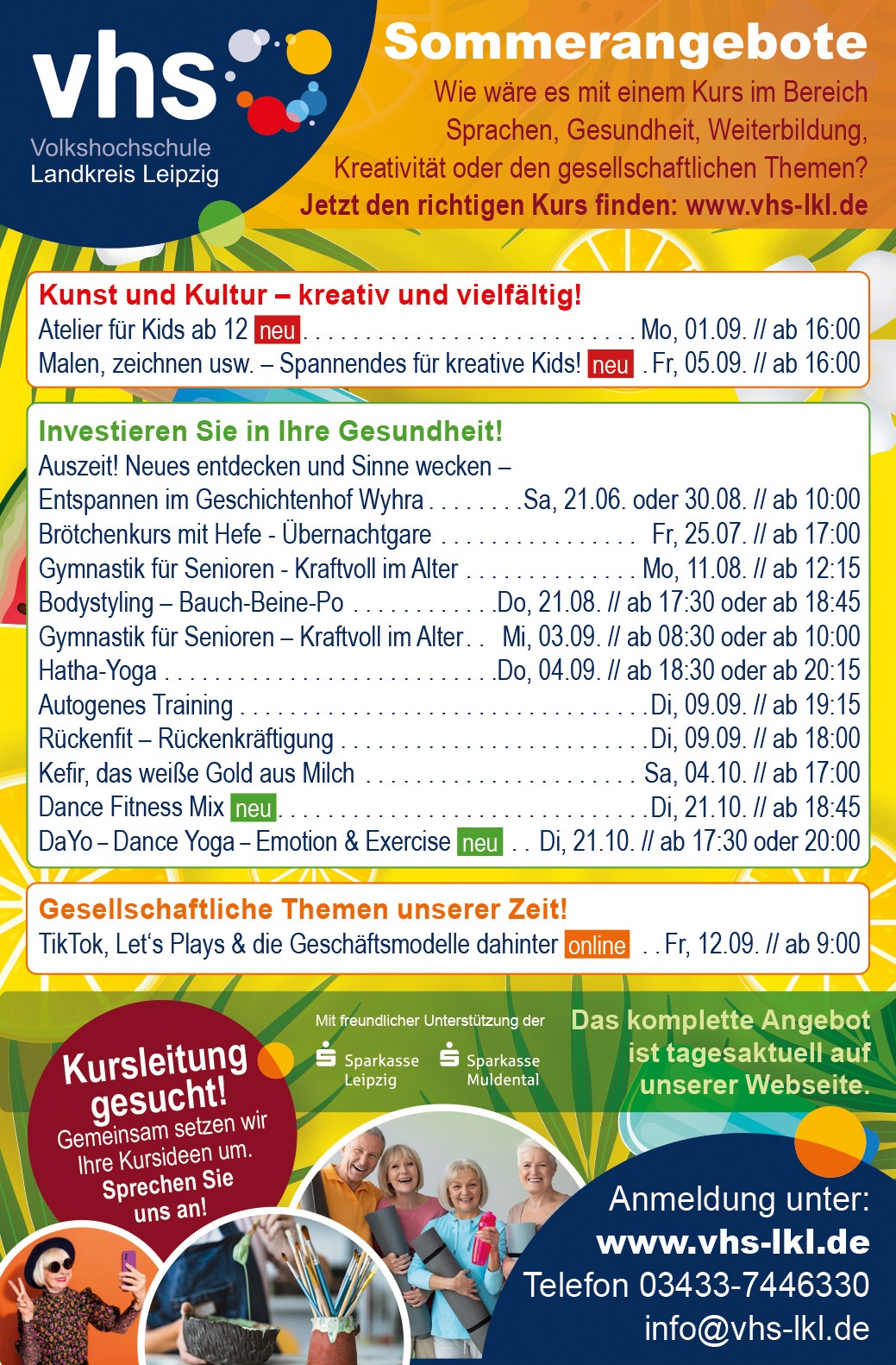 Auch in der warmen Jahreszeit starten an der Volkshochschule im Landkreis Leipzig zahlreiche Angebote. Die Highlights reichen von kreativen Angeboten über entspannende Auszeiten bis hin zu belebenden Bewegungsformaten und spannenden Workshops.
