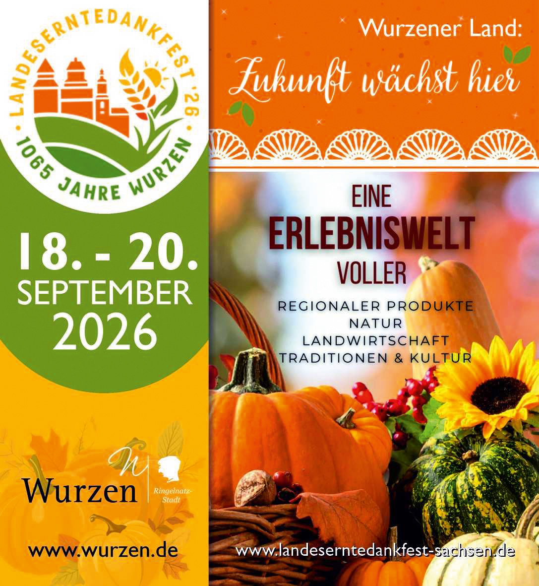 In diesem Jahr findet das Fest vom 18. bis 20. September in Wurzen statt. Das Fest bietet nicht nur Anlass zum gemeinsamen Feiern der Ernte, sondern auch eine besondere Gelegenheit für Vereine, Initiativen, Unternehmen und Kommunen aus der Region, sich zu präsentieren und die Vielfalt des Wurzener Landes und auch des gesamten Landkreises sichtbar zu machen. Gemeinsam wird gezeigt, was die Region lebendig und besonders macht.